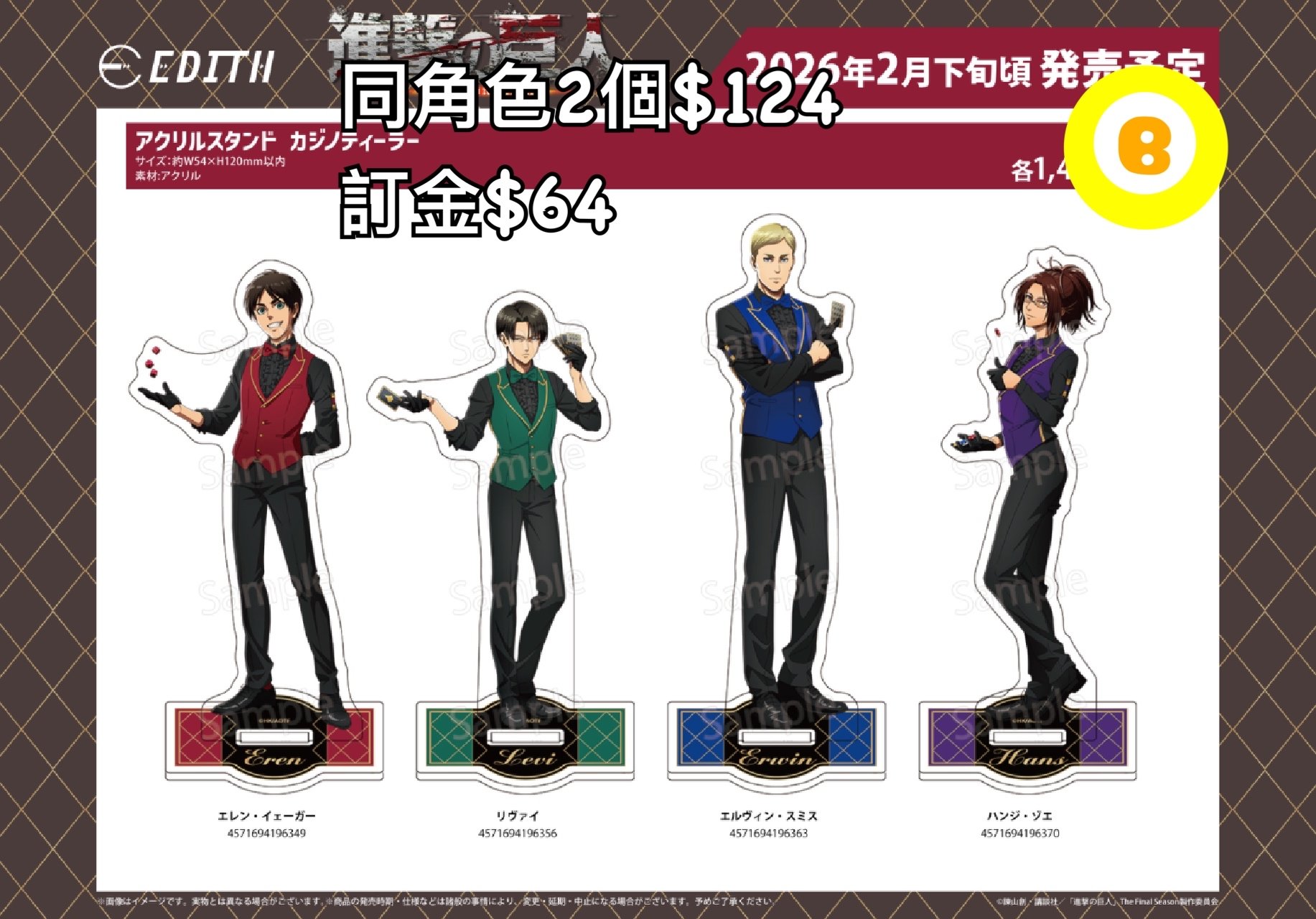 1/2026年日本發貨 預2/2026年到貨 同角色2個$124 訂金$64 🌟可到網站訂購(請見關於) 貨到屯碼/旺角面交/旺角合作交收中心取貨/荔枝角門市/順豐到付/平郵/易寄取 💡大型盒類商品只限面交或順豐到付 1️⃣如選擇郵寄的客人請明白郵寄存在一定風險、寄失或因郵寄途中有損壞小店無法負責 2️⃣預訂產品就發售日期及發售內容或款式可能會與最初公佈時有不同 3️⃣訂購商品為日版(如行版會列明) 4️⃣請明白商品製造時可能會有瑕疵(如sad,甩油有花等等)小店沒法保證及更換 5️⃣不接受盒角有損而更換/退貨/退訂 6️⃣扭蛋基本不連蛋殼交收,如要請事先提出 7️⃣到貨期10日-1個月多,視乎商品數量及發售日期而有早/有遲(另受供應商貨期如分幾次送貨、指定月分配送、物流延誤而有所推遲,請諒解) 8️⃣已落訂金商品如因缺貨/日本砍單/派貨數目不足/分配不均而無法交付,訂金一律退回。另請不要以落單後可以取消的心態下單,因為除以上情況外,一律不接受退訂 9️⃣到貨後請盡量盡快回覆交收方法/面交日期時間,除仲有其他商品未到,最好一個月內完成交收(包括支付郵費),逾期商品會回收 所有費用一律不退還