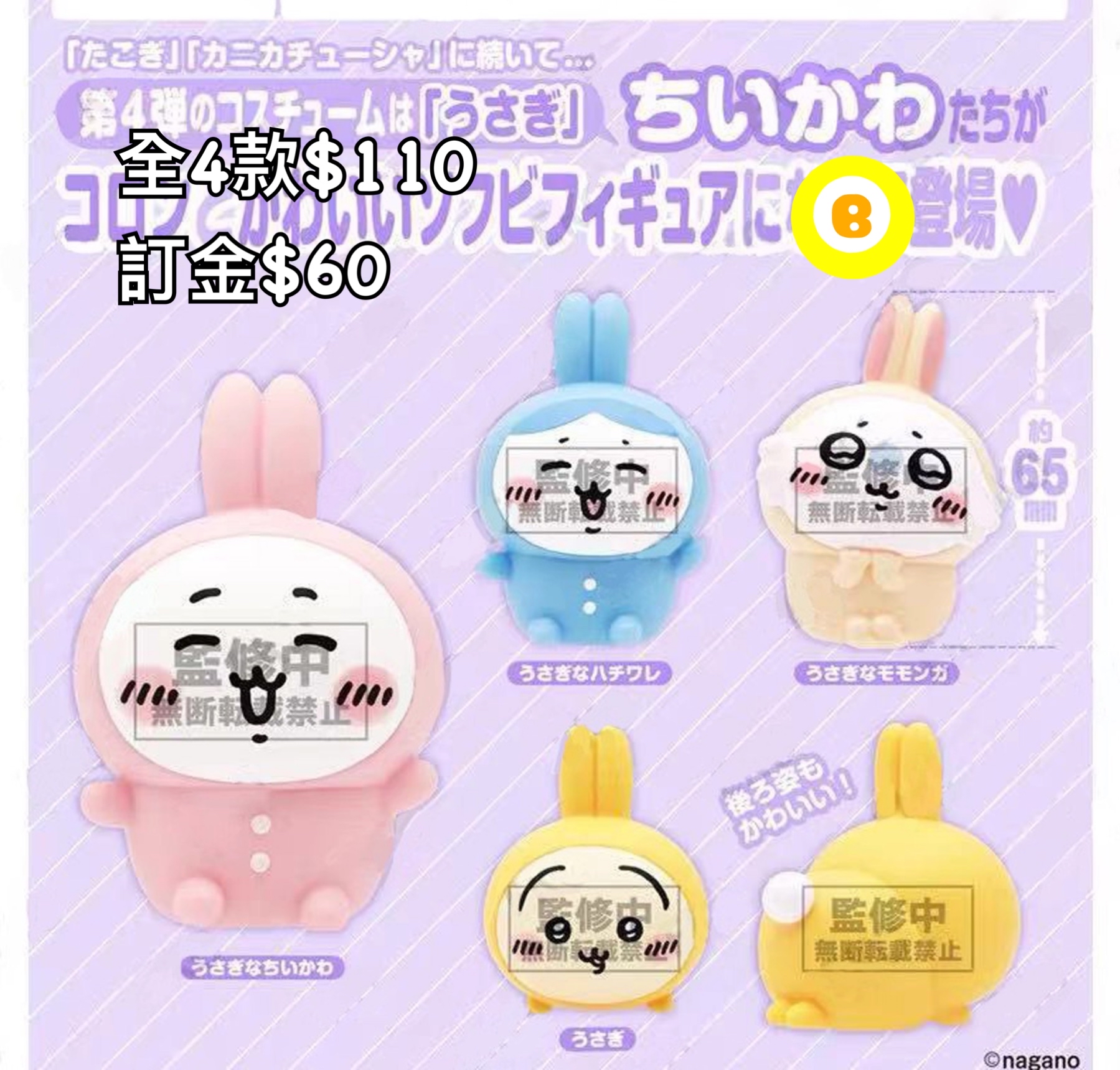 1/2026年日本發貨 預2/2026年到貨 全4款$110 訂金$60 🌟可到網站訂購(請見關於) 貨到屯碼/旺角面交/旺角合作交收中心取貨/荔枝角門市/順豐到付/平郵/易寄取 💡大型盒類商品只限面交或順豐到付 1️⃣如選擇郵寄的客人請明白郵寄存在一定風險、寄失或因郵寄途中有損壞小店無法負責 2️⃣預訂產品就發售日期及發售內容或款式可能會與最初公佈時有不同 3️⃣訂購商品為日版(如行版會列明) 4️⃣請明白商品製造時可能會有瑕疵(如sad,甩油有花等等)小店沒法保證及更換 5️⃣不接受盒角有損而更換/退貨/退訂 6️⃣扭蛋基本不連蛋殼交收,如要請事先提出 7️⃣到貨期10日-1個月多,視乎商品數量及發售日期而有早/有遲(另受供應商貨期如分幾次送貨、指定月分配送、物流延誤而有所推遲,請諒解) 8️⃣已落訂金商品如因缺貨/日本砍單/派貨數目不足/分配不均而無法交付,訂金一律退回。另請不要以落單後可以取消的心態下單,因為除以上情況外,一律不接受退訂 9️⃣到貨後請盡量盡快回覆交收方法/面交日期時間,必須一個月內完成交收(包括支付郵費),逾期商品會回收,所有費用一律不退還 以上適用於網站及IG全部商品和預訂以及不限時間(即使舊有預訂或現貨也適用) 本店保留隨時更改或終止部分條款之權利並視客人在成功下單後已接受及理解當中條款