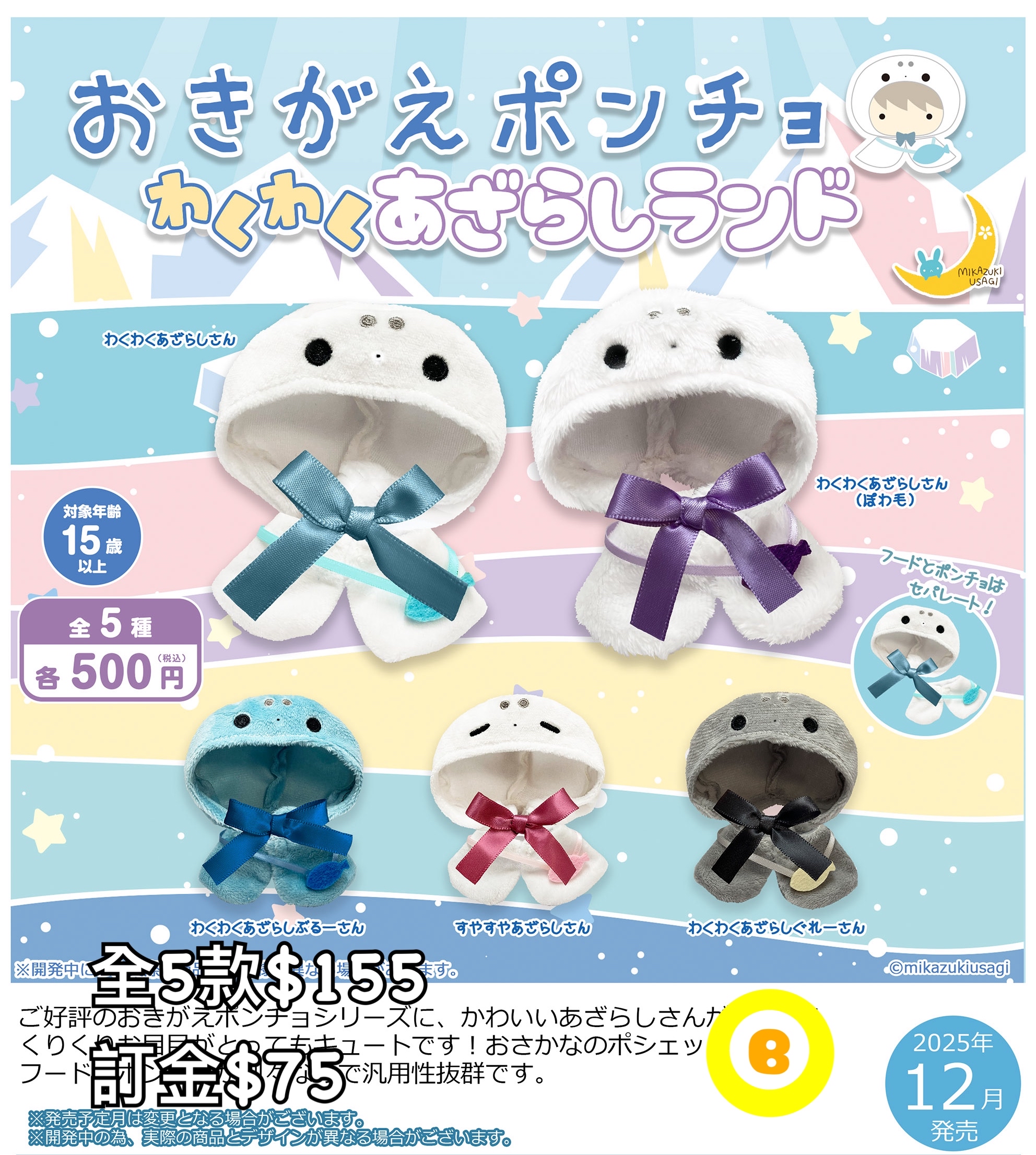 12/2025年日本發貨 預1/2026年到貨 全5款$155 訂金$75 🌟可到網站訂購(請見關於) 貨到屯碼/旺角面交/旺角合作交收中心取貨/荔枝角門市/順豐到付/平郵/易寄取 💡大型盒類商品只限面交或順豐到付 1️⃣如選擇郵寄的客人請明白郵寄存在一定風險、寄失或因郵寄途中有損壞小店無法負責 2️⃣預訂產品就發售日期及發售內容或款式可能會與最初公佈時有不同 3️⃣訂購商品為日版(如行版會列明) 4️⃣請明白商品製造時可能會有瑕疵(如sad,甩油有花等等)小店沒法保證及更換 5️⃣不接受盒角有損而更換/退貨/退訂 6️⃣扭蛋基本不連蛋殼交收,如要請事先提出 7️⃣到貨期10日-1個月多,視乎商品數量及發售日期而有早/有遲(另受供應商貨期如分幾次送貨、指定月分配送、物流延誤而有所推遲,請諒解) 8️⃣已落訂金商品如因缺貨/日本砍單/派貨數目不足/分配不均而無法交付,訂金一律退回。另請不要以落單後可以取消的心態下單,因為除以上情況外,一律不接受退訂 9️⃣到貨後請盡量盡快回覆交收方法/面交日期時間,必須一個月內完成交收(包括支付郵費),逾期商品會回收,所有費用一律不退還 以上適用於網站及IG全部商品和預訂以及不限時間(即使舊有預訂或現貨也適用) 本店保留隨時更改或終止部分條款之權利並視客人在成功下單後已接受及理解當中條款