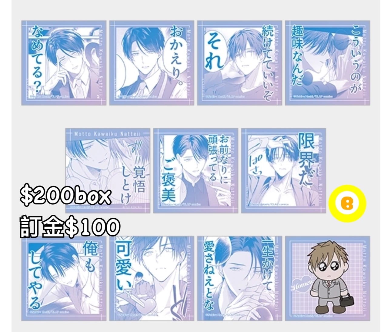 3/2026年日本發貨 預4/2026年到貨 原盒11包$200 訂金$100 🌟可到網站訂購(請見關於) 貨到屯碼/旺角面交/旺角合作交收中心取貨/荔枝角門市/順豐到付/平郵/易寄取 💡大型盒類商品只限面交或順豐到付 1️⃣如選擇郵寄的客人請明白郵寄存在一定風險、寄失或因郵寄途中有損壞小店無法負責 2️⃣預訂產品就發售日期及發售內容或款式可能會與最初公佈時有不同 3️⃣訂購商品為日版(如行版會列明) 4️⃣請明白商品製造時可能會有瑕疵(如sad,甩油有花等等)小店沒法保證及更換 5️⃣不接受盒角有損而更換/退貨/退訂 6️⃣扭蛋基本不連蛋殼交收,如要請事先提出 7️⃣到貨期10日-1個月多,視乎商品數量及發售日期而有早/有遲(另受供應商貨期如分幾次送貨、指定月分配送、物流延誤而有所推遲,請諒解) 8️⃣已落訂金商品如因缺貨/日本砍單/派貨數目不足/分配不均而無法交付,訂金一律退回。(供應商絕大機會安排出貨時才會通知以上情況)另請不要以落單後可以取消的心態下單,因為除以上情況外,一律不接受退訂 9️⃣到貨後請盡量盡快回覆交收方法/面交日期時間,必須一個月內完成交收(包括支付郵費),逾期商品會回收,所有費用一律不退還 以上適用於網站及IG全部商品和預訂以及不限時間(即使舊有預訂或現貨也適用) 本店保留隨時更改或終止部分條款之權利並視客人在成功下單後已接受及理解當中條款