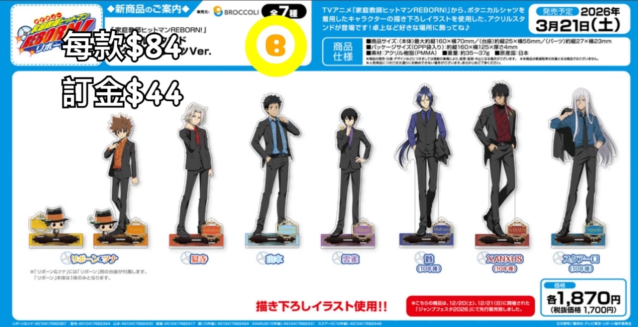 3/2026年日本發貨 預4/2026年到貨 每款$84 訂金$44 🌟可到網站訂購(請見關於) 貨到屯碼/旺角面交/旺角合作交收中心取貨/荔枝角門市/順豐到付/平郵/易寄取 💡大型盒類商品只限面交或順豐到付 1️⃣如選擇郵寄的客人請明白郵寄存在一定風險、寄失或因郵寄途中有損壞小店無法負責 2️⃣預訂產品就發售日期及發售內容或款式可能會與最初公佈時有不同 3️⃣訂購商品為日版(如行版會列明) 4️⃣請明白商品製造時可能會有瑕疵(如sad,甩油有花等等)小店沒法保證及更換 5️⃣不接受盒角有損而更換/退貨/退訂 6️⃣扭蛋基本不連蛋殼交收,如要請事先提出 7️⃣到貨期10日-1個月多,視乎商品數量及發售日期而有早/有遲(另受供應商貨期如分幾次送貨、指定月分配送、物流延誤而有所推遲,請諒解) 8️⃣已落訂金商品如因缺貨/日本砍單/派貨數目不足/分配不均而無法交付,訂金一律退回。另請不要以落單後可以取消的心態下單,因為除以上情況外,一律不接受退訂 9️⃣到貨後請盡量盡快回覆交收方法/面交日期時間,必須一個月內完成交收(包括支付郵費),逾期商品會回收,所有費用一律不退還 以上適用於網站及IG全部商品和預訂以及不限時間(即使舊有預訂或現貨也適用) 本店保留隨時更改或終止部分條款之權利並視客人在成功下單後已接受及理解當中條款手