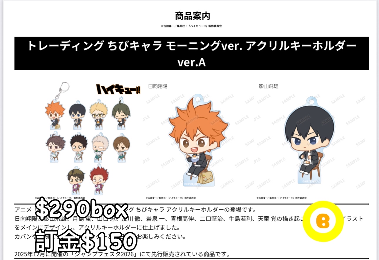 3/2026年日本發貨 預4/2026年到貨 原盒10包$290 訂金$150 🌟可到網站訂購(請見關於) 貨到屯碼/旺角面交/旺角合作交收中心取貨/荔枝角門市/順豐到付/平郵/易寄取 💡大型盒類商品只限面交或順豐到付 1️⃣如選擇郵寄的客人請明白郵寄存在一定風險、寄失或因郵寄途中有損壞小店無法負責 2️⃣預訂產品就發售日期及發售內容或款式可能會與最初公佈時有不同 3️⃣訂購商品為日版(如行版會列明) 4️⃣請明白商品製造時可能會有瑕疵(如sad,甩油有花等等)小店沒法保證及更換 5️⃣不接受盒角有損而更換/退貨/退訂 6️⃣扭蛋基本不連蛋殼交收,如要請事先提出 7️⃣到貨期10日-1個月多,視乎商品數量及發售日期而有早/有遲(另受供應商貨期如分幾次送貨、指定月分配送、物流延誤而有所推遲,請諒解) 8️⃣已落訂金商品如因缺貨/日本砍單/派貨數目不足/分配不均而無法交付,訂金一律退回。(供應商絕大機會安排出貨時才會通知以上情況)另請不要以落單後可以取消的心態下單,因為除以上情況外,一律不接受退訂 9️⃣到貨後請盡量盡快回覆交收方法/面交日期時間,除仲有其他商品未到,最好一個月內完成交收(包括支付郵費),逾期商品會回收 所有費用一律不退還