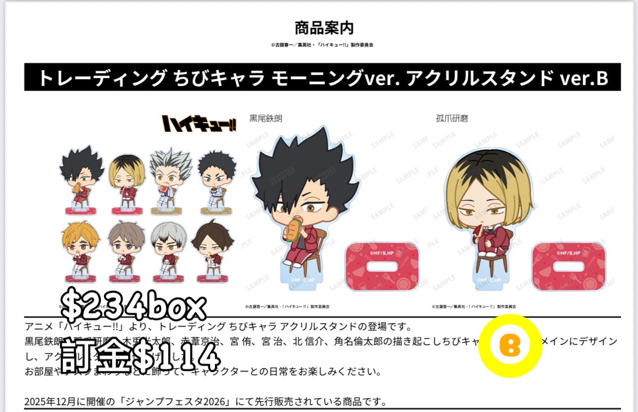 3/2026年日本發貨 預4/2026年到貨 原盒8包$234 訂金$114 🌟可到網站訂購(請見關於) 貨到屯碼/旺角面交/旺角合作交收中心取貨/荔枝角門市/順豐到付/平郵/易寄取 💡大型盒類商品只限面交或順豐到付 1️⃣如選擇郵寄的客人請明白郵寄存在一定風險、寄失或因郵寄途中有損壞小店無法負責 2️⃣預訂產品就發售日期及發售內容或款式可能會與最初公佈時有不同 3️⃣訂購商品為日版(如行版會列明) 4️⃣請明白商品製造時可能會有瑕疵(如sad,甩油有花等等)小店沒法保證及更換 5️⃣不接受盒角有損而更換/退貨/退訂 6️⃣扭蛋基本不連蛋殼交收,如要請事先提出 7️⃣到貨期10日-1個月多,視乎商品數量及發售日期而有早/有遲(另受供應商貨期如分幾次送貨、指定月分配送、物流延誤而有所推遲,請諒解) 8️⃣已落訂金商品如因缺貨/日本砍單/派貨數目不足/分配不均而無法交付,訂金一律退回。(供應商絕大機會安排出貨時才會通知以上情況)另請不要以落單後可以取消的心態下單,因為除以上情況外,一律不接受退訂 9️⃣到貨後請盡量盡快回覆交收方法/面交日期時間,除仲有其他商品未到,最好一個月內完成交收(包括支付郵費),逾期商品會回收 所有費用一律不退還