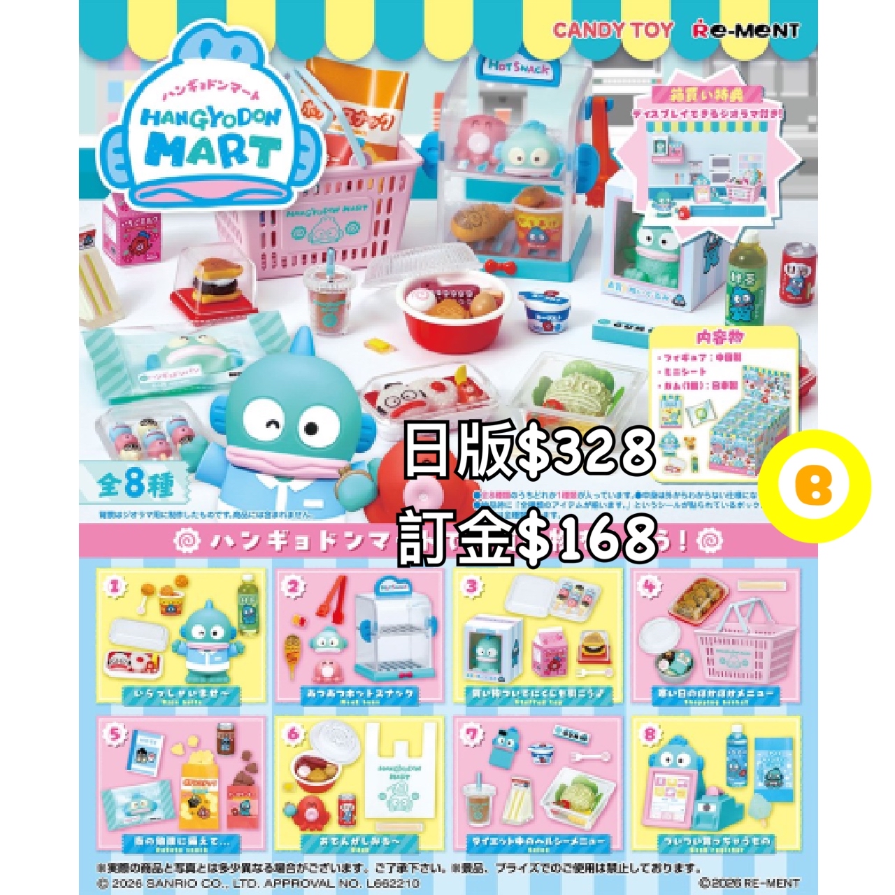 3/2026年日本發貨 預4/2026年到貨 原盒8包$328 訂金$168 🌟可到網站訂購(請見關於) 貨到屯碼/旺角面交/旺角合作交收中心取貨/荔枝角門市/順豐到付/平郵/易寄取 💡大型盒類商品只限面交或順豐到付 1️⃣如選擇郵寄的客人請明白郵寄存在一定風險、寄失或因郵寄途中有損壞小店無法負責 2️⃣預訂產品就發售日期及發售內容或款式可能會與最初公佈時有不同 3️⃣訂購商品為日版(如行版會列明) 4️⃣請明白商品製造時可能會有瑕疵(如sad,甩油有花等等)小店沒法保證及更換 5️⃣不接受盒角有損而更換/退貨/退訂 6️⃣扭蛋基本不連蛋殼交收,如要請事先提出 7️⃣到貨期10日-1個月多,視乎商品數量及發售日期而有早/有遲(另受供應商貨期如分幾次送貨、指定月分配送、物流延誤而有所推遲,請諒解) 8️⃣已落訂金商品如因缺貨/日本砍單/派貨數目不足/分配不均而無法交付,訂金一律退回。另請不要以落單後可以取消的心態下單,因為除以上情況外,一律不接受退訂 9️⃣到貨後請盡量盡快回覆交收方法/面交日期時間,必須一個月內完成交收(包括支付郵費),逾期商品會回收,所有費用一律不退還 以上適用於網站及IG全部商品和預訂以及不限時間(即使舊有預訂或現貨也適用) 本店保留隨時更改或終止部分條款之權利並視客人在成功下單後已接受及理解當中條款
