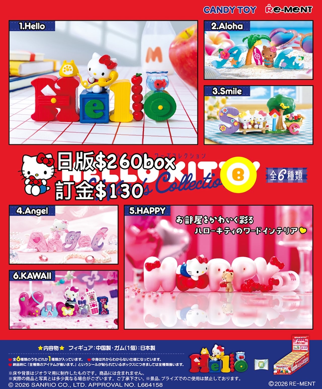4/2026年日本發貨 預5/2026年到貨 原盒6包$260 訂金$130 🌟可到網站訂購(請見關於) 貨到屯碼/旺角面交/旺角合作交收中心取貨/荔枝角門市/順豐到付/平郵/易寄取 💡大型盒類商品只限面交或順豐到付 1️⃣如選擇郵寄的客人請明白郵寄存在一定風險、寄失或因郵寄途中有損壞小店無法負責 2️⃣預訂產品就發售日期及發售內容或款式可能會與最初公佈時有不同 3️⃣訂購商品為日版(如行版會列明) 4️⃣請明白商品製造時可能會有瑕疵(如sad,甩油有花等等)小店沒法保證及更換 5️⃣不接受盒角有損而更換/退貨/退訂 6️⃣扭蛋基本不連蛋殼交收,如要請事先提出 7️⃣到貨期10日-1個月多,視乎商品數量及發售日期而有早/有遲(另受供應商貨期如分幾次送貨、指定月分配送、物流延誤而有所推遲,請諒解) 8️⃣已落訂金商品如因缺貨/日本砍單/派貨數目不足/分配不均而無法交付,訂金一律退回。(供應商絕大機會安排出貨時才會通知以上情況)另請不要以落單後可以取消的心態下單,因為除以上情況外,一律不接受退訂 9️⃣到貨後請盡量盡快回覆交收方法/面交日期時間,必須一個月內完成交收(包括支付郵費),逾期商品會回收,所有費用一律不退還 以上適用於網站及IG全部商品和預訂以及不限時間(即使舊有預訂或現貨也適用) 本店保留隨時更改或終止部分條款之權利並視客人在成功下單後已接受及理解當中條款